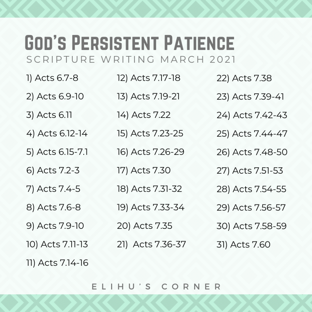 As we write through Acts 6 and 7 this month, consider the unfailing love and astounding patience of our Heavenly Father. May He grant us wisdom to share the Word with those who are lost. May He continue to extend patience to us as we follow Him through this life.