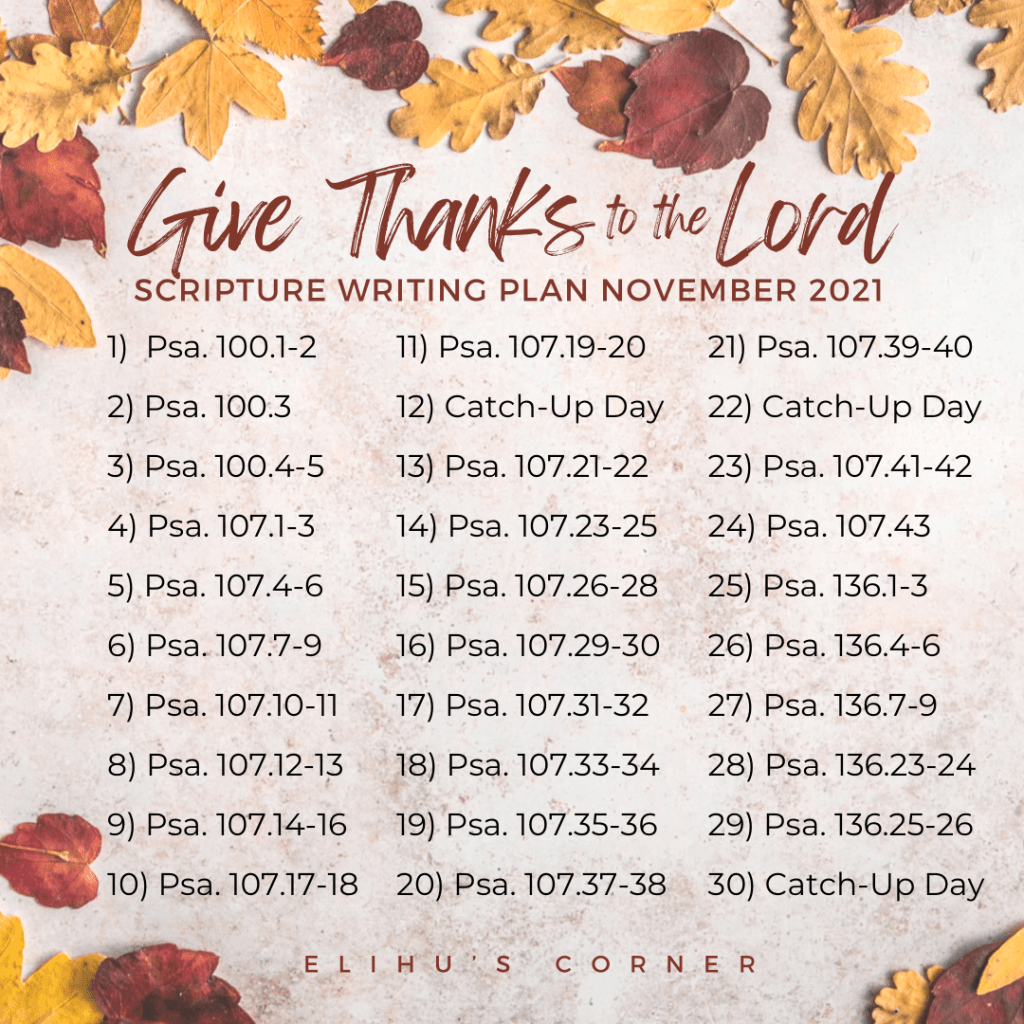 As you write through the plan this month, make note of scriptures that are particularly poignant to you and post them somewhere as a reminder to always give thanks to the Lord for His love, His discipline, His mercy, His faithfulness, and the salvation we have through His Son, Jesus Christ.
