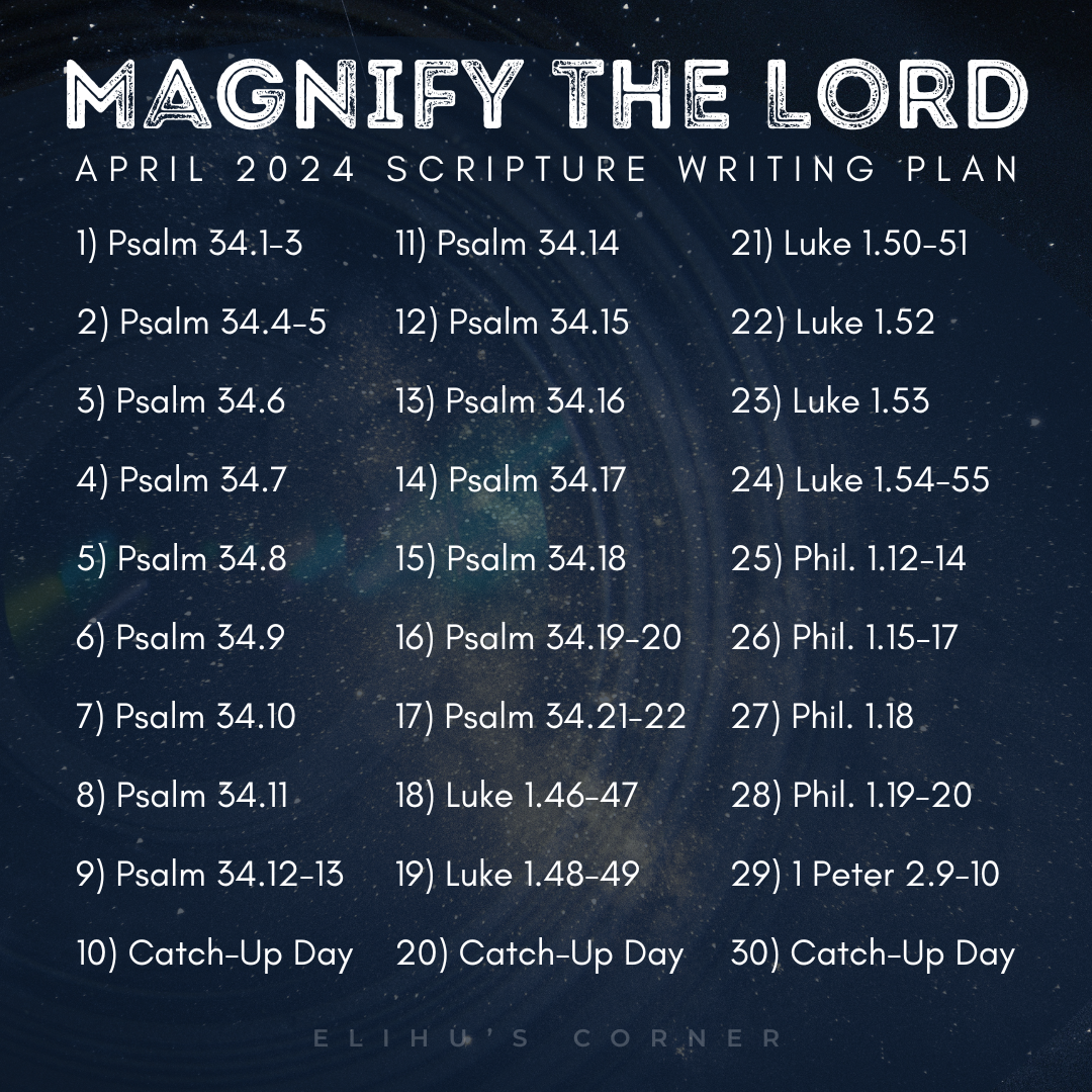 Throughout the first half of April, we will be writing through Psalm 34, in which David wrote of magnifying, praising, and seeking the Lord. As you write through this Psalm, notice the blessings and joys that accompany “magnifying the Lord” and “exalting His name.” I hope that as you consider each scripture this month, you will be encouraged to magnify the Lord with me.