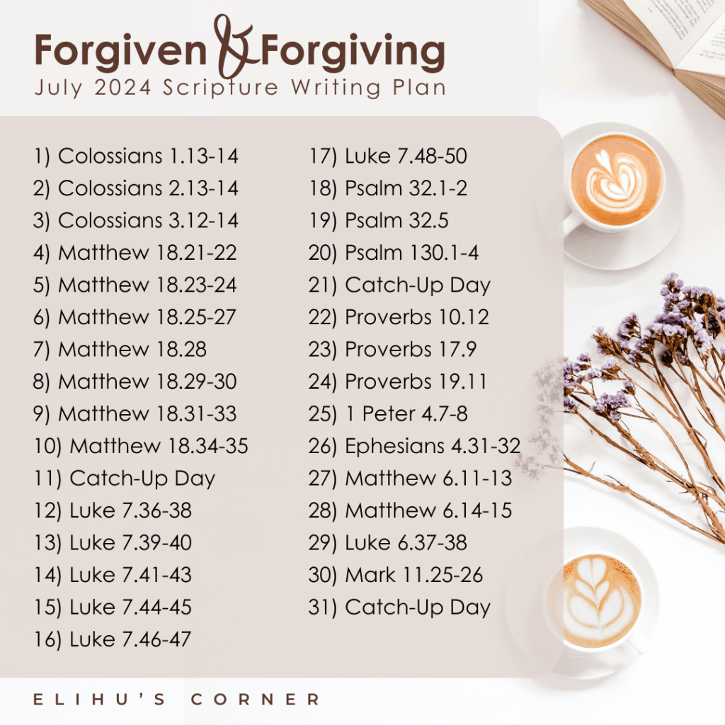 I hope you’ll join us this month as we copy these passages. I frequently post each day’s verse on Facebook and Instagram (@elihuscorner). Please stop by and leave a comment or a question. I always love hearing your insights!