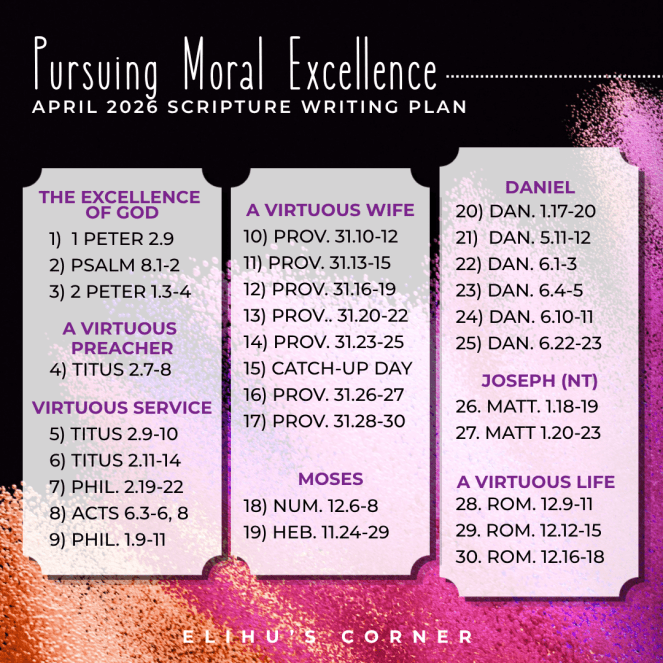 I hope you’ll join us this month as we consider the pursuit of moral excellence (virtue)! Click the link below to download a printable copy of the plan. If you’ve got small scripture writers, click the links below to download either the tracing or copying pages so they can write along with you.