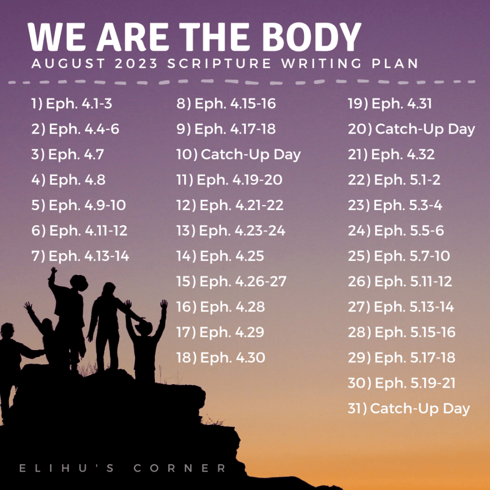 Have you had the privilege of watching a newborn baby grow into an adult? You endure the sleepless nights, often treasuring those peaceful moments when that soft little head nestles into your shoulder. You take lots of deep breaths through the threenager stage, enjoying the babble of that developing voice while trying to not to… Continue reading We are the Body: August 2023 Scripture Writing Plan