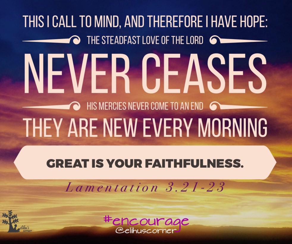 Remember my affliction and my wanderings, the wormwood and the gall! My soul continually remembers it and is bowed down within me. But this I call to mind, and therefore I have hope: The steadfast love of the Lord never ceases; his mercies never come to an end; they are new every morning; great is your faithfulness. “The Lord is my portion,” says… Continue reading Hope is rising (Day 18 of the #encourage marathon)
