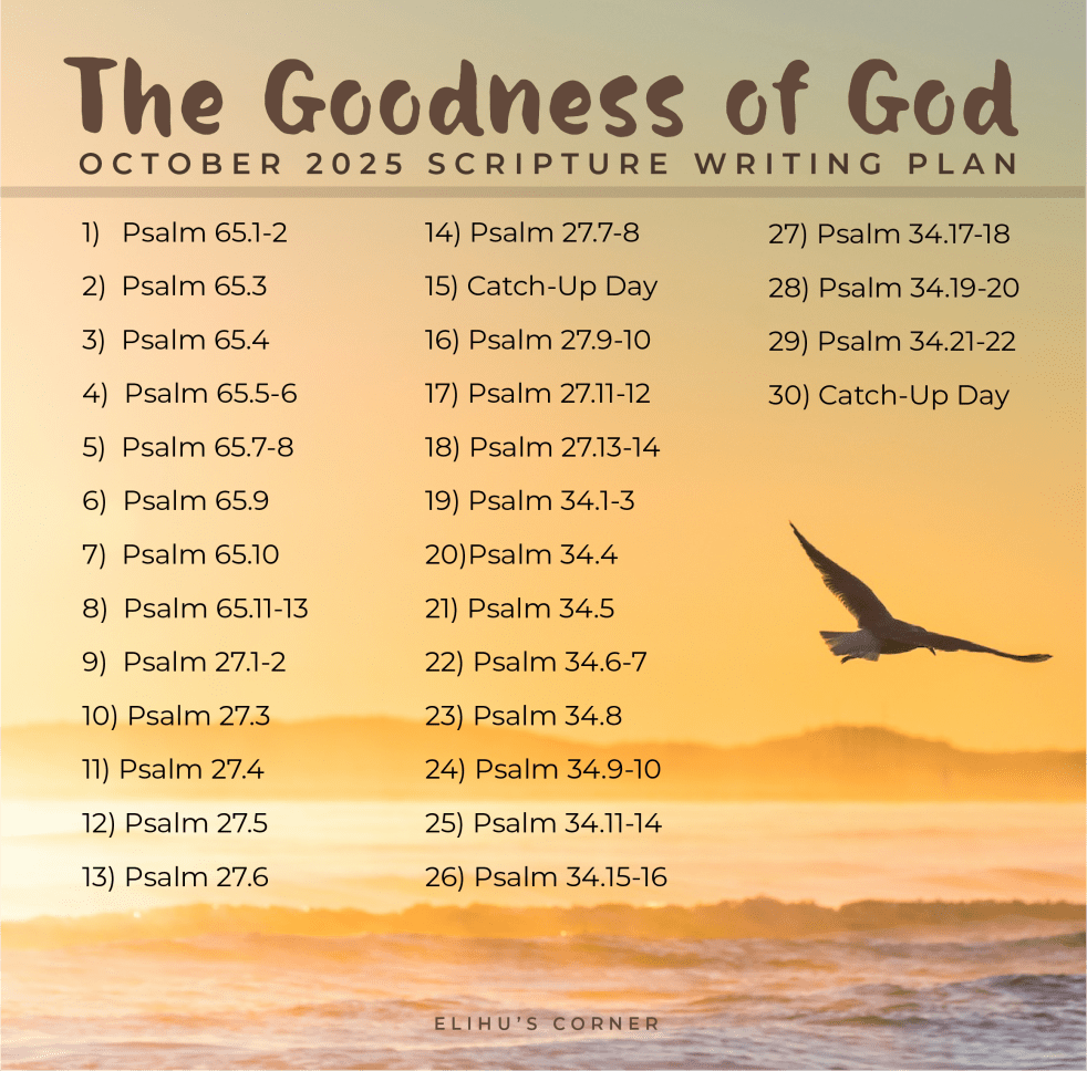 Consider what it would be like to know that you will have nonstop pain, discomfort, darkness, or fear without any relief. Have you ever thought about what that might be like? When I was in my third year of college, I suffered the excruciating pain of kidney stones. When the pain began, I had no… Continue reading The Goodness of God: November 2025 Scripture Writing Plan