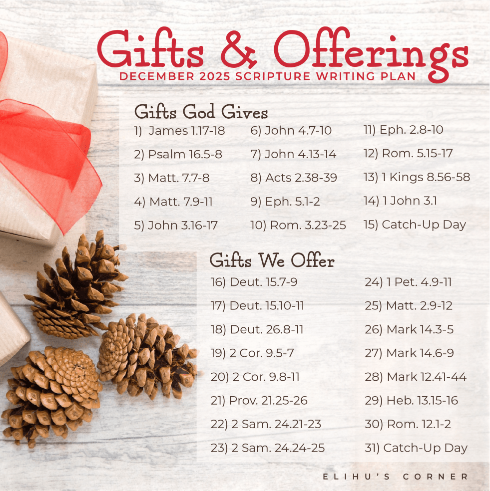 As a child, I used to relish the anticipation of gifts, whether it was for my birthday or Christmas. As an adult, I find greater satisfaction in selecting gifts and watching as people open and delight in them. Gifts given with love and received with thankfulness are a recipe for joy. As the Thanksgiving holiday… Continue reading Gifts & Offerings: December 2025 Scripture Writing Plan